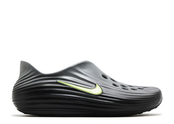 The Nike ReactX Rejuven8 'Black Volt' is made with molded ReactX foam. The upper half has multiple vent ports throughout the vamp. The bottom half consists of a radial-pattern rubber outsole, while the side sports a molded, volt-colored Swoosh.